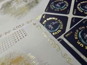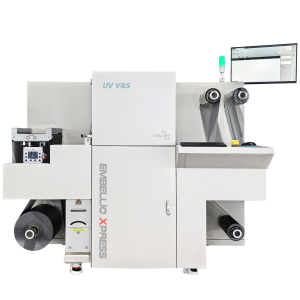 UV atramentová skrášľovacia (embellishment) tlačiareň s jedným prechodom (singlepass) na bodové lakovanie (spot varnishing) a inline fóliovanie.
